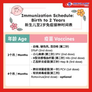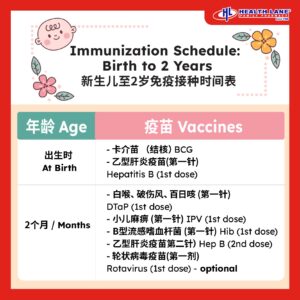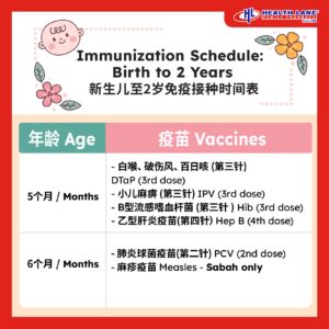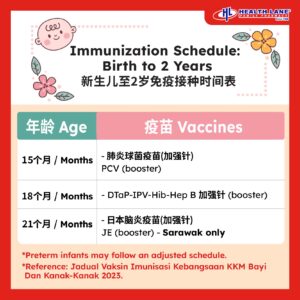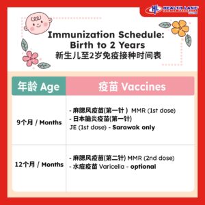 - On 21 months (Sarawak only): JE booster, helps protect against Japanese Encephalitis (mosquito-borne brain infection)